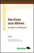 Éducation et Apprentissage de la petite enfance Manitoba offre aux élèves manitobains aveugles ou malvoyants des services de soutien en matière d'éducation. Les services peuvent inclure un soutien spécifique pour l’élève pour un enseignement direct pour l’enseignement du Braille, technologie d’adaptation, etc. ou un appui consultatif pour les équipes scolaires pour les élèves avec une déficience visuelle. Les conseillers pour les aveugles et les malvoyants sont membres de l’équipe scolaire qui met l’accent sur les besoins des élèves avec une perte de vision. Les conseillers travaillent avec les élèves, les écoles et les familles pour appuyer avec le programme d’études d’Éducation et Apprentissage de la petite enfance Manitoba et le programme d’apprentissage spécifique pour les élèves aveugles et malvoyants pour assurer une participation active des élèves dans l’école, à la maison et la communauté.